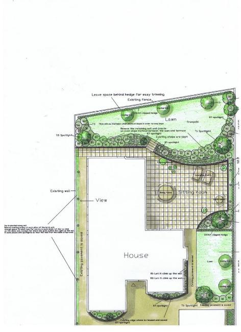 • Design och ritning av hela eller delar av trädgården. Inkluderar utformning av gångvägar, sittplatser, planteringar, trädgårdsbelysning, murar, staket, pool, vattendamm, val av utemöbler och krukor mm.